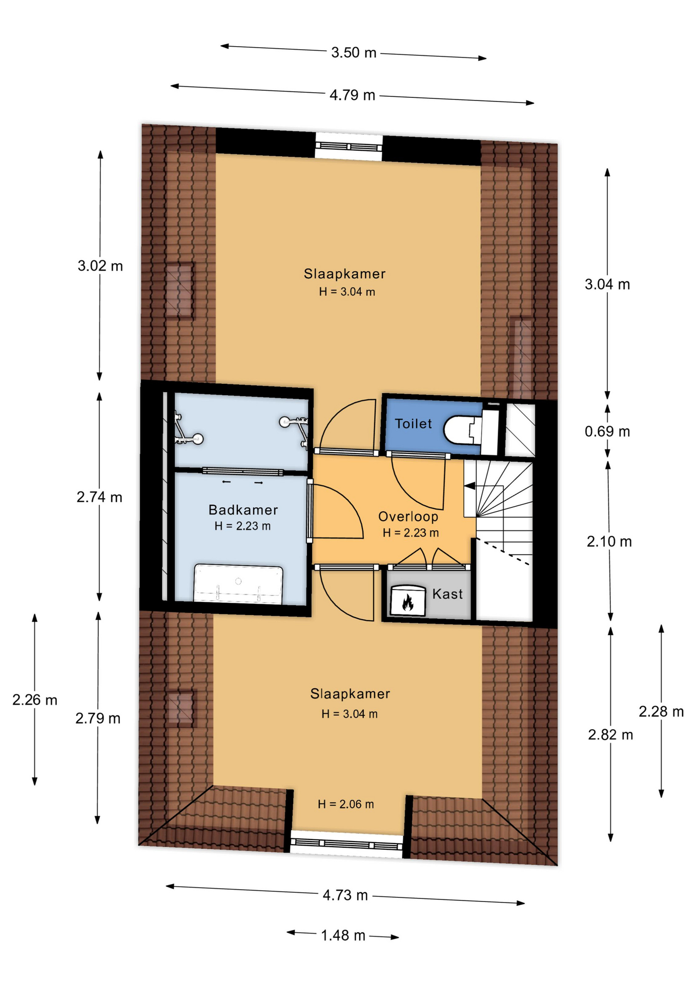Vanuit de overloop de trap naar de tweede etage, overloop met technische ruimte en apart toilet, riante slaapkamer aan de voorzijde met dakkapel, tweede ruime slaapkamer gelegen aan de achterzijde en de tussengelegen vliering is te gebruiken als opslagruimte. Tot slot de stijlvolle badkamer voorzien van fraai tegelwerk, meubel met dubbele wastafel, handdoekradiator en dubbele inloopdouche met glazen wand.