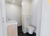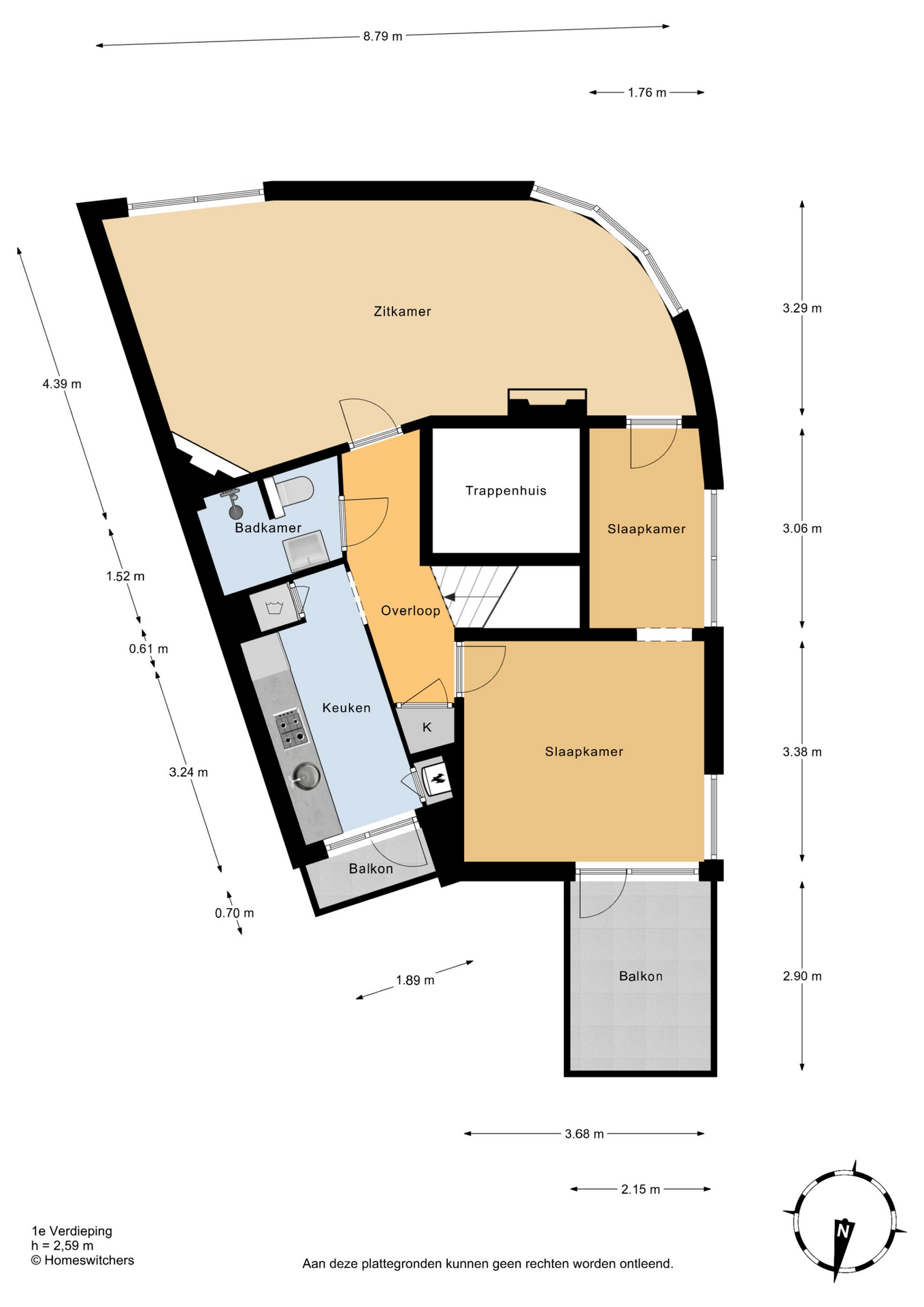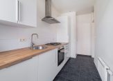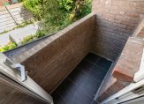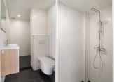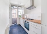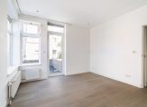 Entree van het appartement op straatniveau, met trap naar de 1e etage. Hal met toegang tot de woonkamer aan de rechterzijde, gelegen op de hoek van het pand, wat resulteert in een fraai uitzicht en fantastische lichtinval. De tussengelegen keuken is voorzien van oven, vaatwasser, 4-pits gasfornuis, afzuigkap, koelkast, vriezer en toegang tot het tweede balkon. De hoofdslaapkamer bevindt zich aan de achterzijde, met toegang tot het terras en de 2e slaapkamer is bereikbaar via de living. De moderne badkamer is voorzien van ruime inloopdouche met regendouche, wastafel met badkamermeubel en toilet.