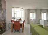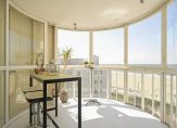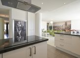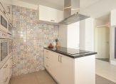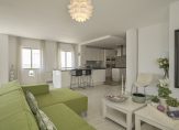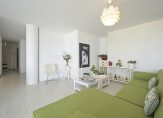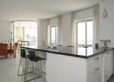 Entrance to the apartment into a spacious hall with a modern cloakroom fitted with a WC and handbasin, and a niche for hanging coats. Entrance into the approx. 72m2 living room. To the right there is the lovely, spacious, open-plan kitchen that has all the necessary fitted appliances, including a dishwasher, wide induction hob, cooker hood, no less than 3 ovens and a microwave, beautiful, natural stone worktop that continues through to the dining room table, with extra storage space. The living room offers fabulous views and lots of room for a big lounging area and a dining room table. From the conservatory with sliding glass doors, you get fantastic, unspoilt views of the beach and sea. There is a corridor through to the TV room / home office with views of the city in the distance.