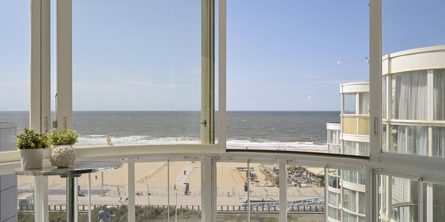 Centrale entree op de begane grond, met de lift naar de 5e etage. Prachtig uitzicht over het Kurhaus, het Beelden Museum en de boulevard.