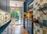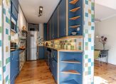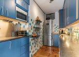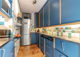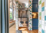 Vanuit de eetkamer is er toegang tot de half-open keuken. Deze is uitgerust met vaatwasser, afzuigkap en semi-professioneel gasfornuis met wokbrander en dubbele oven. Naast het aanrechtblad met dubbele spoelbak is er ruimte voor een vrijstaande koel- vriescombinatie. De ruimte is efficiƫnt benut met keukenkastjes tot het plafond. Ook bevindt zich hier de opstelplaats voor de HR-ketel.