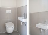In de woonkamer is er genoeg plek voor een zithoek, een werkplek en een lange eetkamertafel. Separaat modern toilet met fonteintje en keurig tegelwerk.