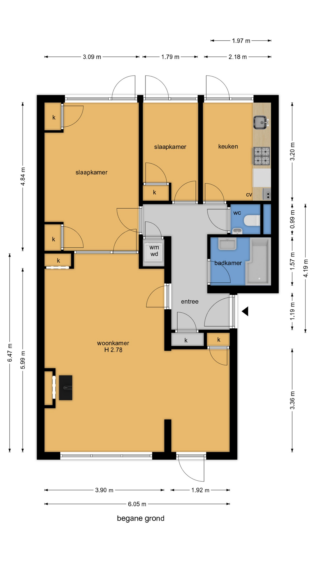Voortuin voor het stallen van uw fietsen. Centrale afgesloten entree met bellentableau, brievenbussen, entree appartement, ruime hal met garderobenis, vaste kast met wasmachine en droger opstelplaats en toegang tot alle vertrekken.