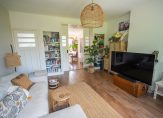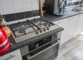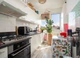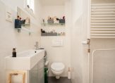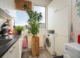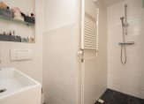 Vanuit de hal de moderne badkamer voorzien van keurig tegelwerk, wandcloset, wastafel, handdoekradiator en inloopdouche. De keuken is eveneens aan de achterzijde gelegen en beschikt over hoog model combioven, wasemkap, 4-pits rvs gaskookplaat, wasmachineaansluiting en opstelplaats voor de cv-ketel.
