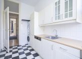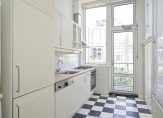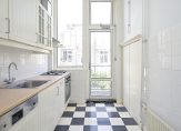 Entree appartement op de begane grond, hal en trap met verlichte trapleuning naar de 1e etage, overloop, kamers en suite met glas-in-lood schuifdeuren, schoorsteenmantels, eenvoudige keuken met inbouw apparatuur en opstelplaats voor wasmachine en wasdroger, toilet-douchecombinatie en deur naar balkon, voorzijkamer.