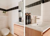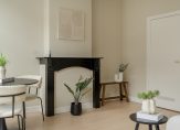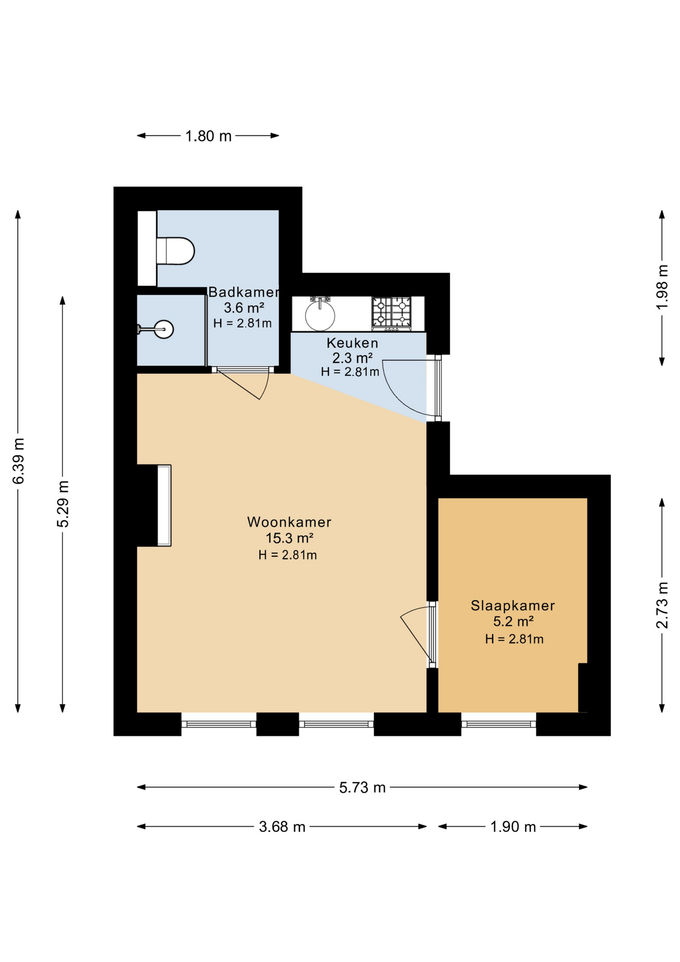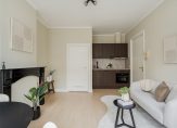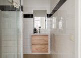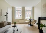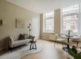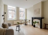 Gezamenlijk entree op straatniveau, trap naar de eerste verdieping, entree appartement, woonkamer met hoog plafond. De nieuwe luxe open keuken is voorzien van een inductiekookplaat, koel-/vriescombinatie, combioven, afzuigkap en. De slaapkamer is gelegen aan de voorzijde. De tussengelegen luxe badkamer is voorzien van fraai tegelwerk, inloopdouche met glazen deur, handdouche en regendouche, badkamermeubel met wastafel, toilet en wasmachineaansluiting.