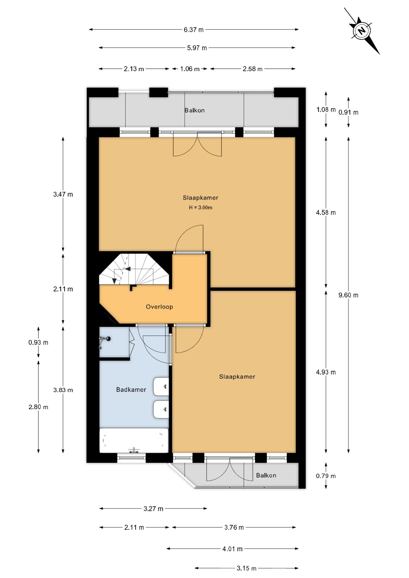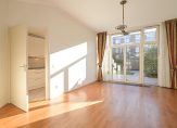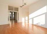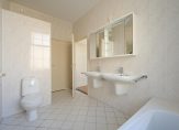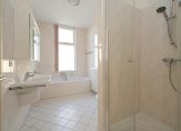 Vanuit de hal de trap naar de eerste etage, riante hoofdslaapkamer aan de achterzijde over de volle breedte met balkon en tweede goed formaat slaapkamer aan de voorzijde eveneens met eigen balkon. De badkamer op deze etage is voorzien van keurig tegelwerk, dubbele wastafel, toilet, douche cabine, ligbad en natuurlijk licht. Het valt op dat deze eerste etage over vrijwel dezelfde hoge plafonds beschikt als de begane grondvloer wat bijdraagt aan een zeer ruimtelijke beleving.