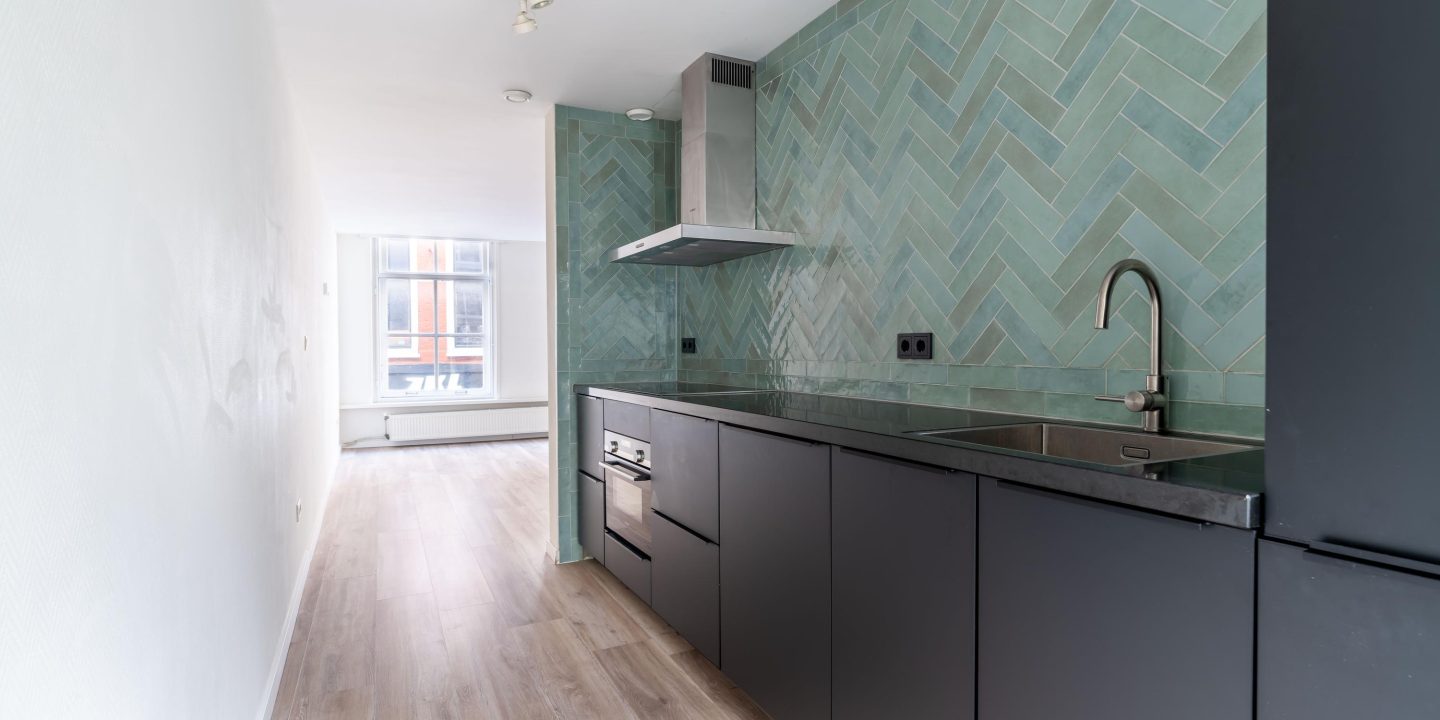 Gezamenlijk entree op de begane grond, trap naar de eerste etage, entree appartement. De luxe halfopen keuken is voorzien van inductiekookplaat, ruime koelkast en vriezer, combioven, afzuigkap en vaatwasser. De keuken is op hoogwaardig niveau afgewerkt en voorzien van fraai tegelwerk. Aan de voorzijde de ruime woonkamer, met een fanatische lichtinval en uitzicht op de levendige winkelstraat. De slaapkamer is gelegen aan de achterzijde en tevens ook van ruim formaat. De tussengelegen badkamer is voorzien van douchecabine, badkamermeubel met wastafel, handdoekradiator, spiegel met opbergruimte, toilet en wasmachineaansluiting. Tussengelegen het zonnige terras van in totaal 10 m².