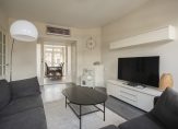 A shared entrance leads to the private entrance of the apartment on the second floor. The hallway features a modern fuse box, a separate WC with a washbasin, and a deep cloakroom/storage cupboard. The kitchen is fitted with a fridge-freezer, five-burner gas hob, microwave, and oven, as well as a cupboard housing the central heating boiler. A door opens onto the balcony, which enjoys unobstructed views and a useful storage cupboard.