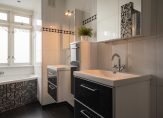 The expansive bathroom includes a built-in cupboard for a washing machine and dryer, a walk-in shower, a bathtub, and a washbasin unit with mirrored cabinets. While both the kitchen and bathroom are slightly dated, they have been well maintained.