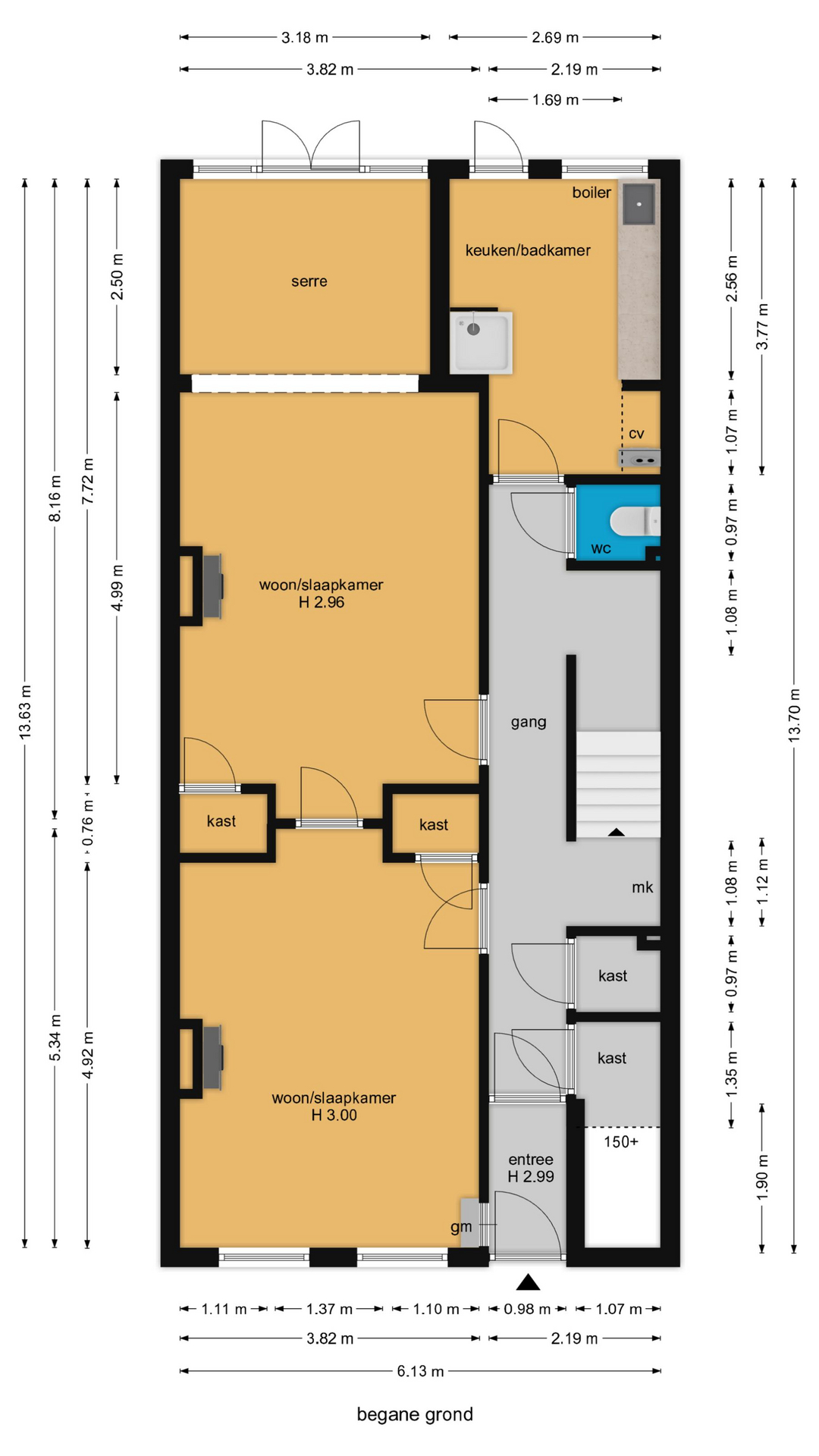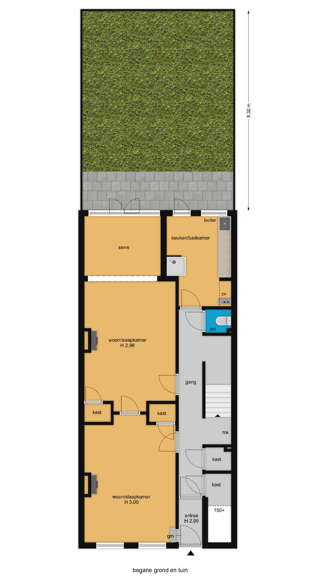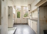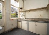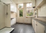 Eigen entree met vestibule, hal met grote trapkast en garderobekast, apart toilet, kamers en suite met hoge ornamenten plafonds, houten vloer, stenen schouw en grote raampartijen. Aan de achterzijde de grote achtertuin die op het zonnige zuidoosten is gelegen. De keuken is voorzien van cv-ketel en eenvoudig keukenblok en dient eigenlijk verplaatst te worden om de indeling te optimaliseren.