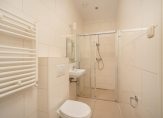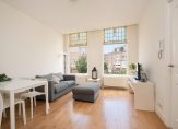 De woonkamer heeft glas in lood ramen, een marmeren schouw, een lichte laminaat vloer en strak gestuukte wanden. Vanuit de woonkamer een deur naar de voorgelegen slaapkamer, achter de keuken ligt de ruime badkamer, uitgevoerd met grote witte wandtegels en lichte vloertegels, ruime douche met schuifwand, wandcloset, een wastafel en wasmachineaansluiting.