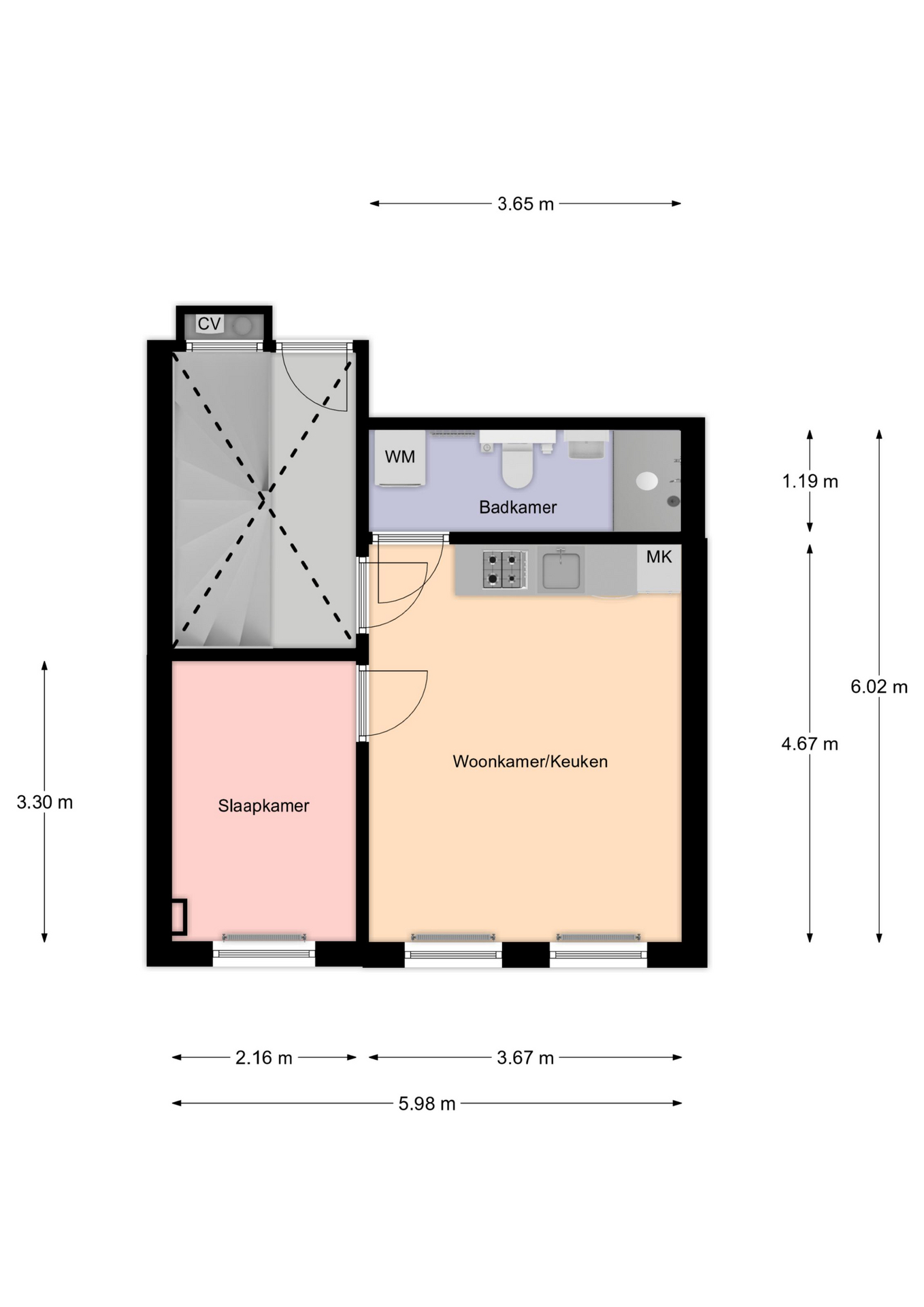 Gezamenlijke entree op de begane grond, hal met de meterkast, trap naar de 1e etage, ruime overloop voorzien van technische ruimte, entree appartement, ruime en lichte woonkamer met een open keuken voorzien van inbouwapparatuur: combi-oven, gasfornuis, koelkast met vriezer en vaatwasser.