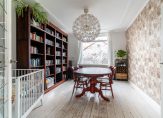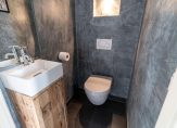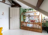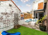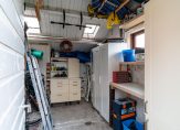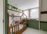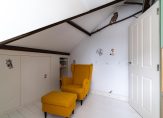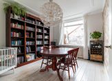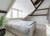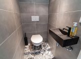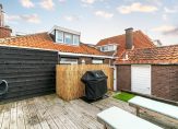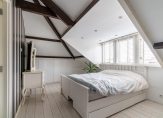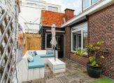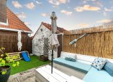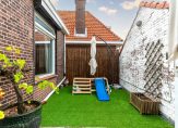 Stairs lead to the second floor, with a landing and a fixed wide cupboard housing the Vaillant central heating boiler, and additional storage space above the stairs. At the end of the hallway, there is a separate modern toilet with a small washbasin. At the front, the charming children’s bedroom offers plenty of storage space and a dormer window, while at the rear, the bright master bedroom also benefits from a dormer window and built-in storage on either side. Both bedrooms have wooden frames with HR++ glazing.