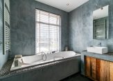 Entrance to the apartment, coat closet, storage space with a water softener, staircase to the first floor, hallway providing access to the first bedroom/home office overlooking the terrace, complete with convenient roller blinds. At the end of the hallway, there is a separate modern toilet with a small washbasin and stylish wall finishes. The bright, modern bathroom is located at the front and includes a rain shower, a luxurious bathtub, and a vanity unit with dual sinks.