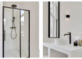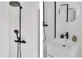 Entrance to the apartment, staircase to the 1st floor, hallway adorned with herringbone PVC flooring throughout the apartment except for the sanitary spaces. A spacious master bedroom at the rear, featuring a modern open bathroom with a rain shower and vanity unit. Separate modern toilet with a small basin and contemporary tiling.