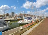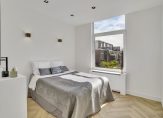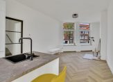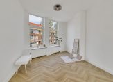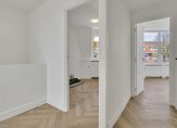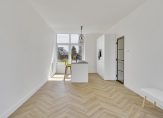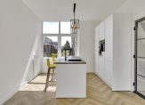 Glazen deur met roedeverdeling naar de woonkamer met de moderne open keuken. De keuken is voorzien van een combioven, Miele vaatwasser, koel/vriescombinatie, inductiekookplaat voorzien van geïntegreerde afzuiging en een gezellige bar. Handige studeer/garderobekamer aan de voorzijde van het appartement.