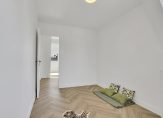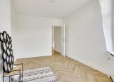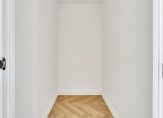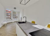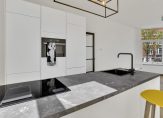 Glass door with muntin bars leading to the living room with the modern open kitchen. The kitchen is equipped with a combination oven, Miele dishwasher, fridge/freezer combination, induction hob with integrated ventilation, and a cozy bar. Convenient study/wardrobe room at the front of the apartment.