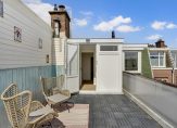 Trap naar de 2e etage, ruime overloop, deur naar het heerlijk zonnig en beschut terras met vrij uitzicht, vaste brede kast met de wasmachine opstelplaats, extra bergruimte, Intergas CV-combiketel uit 2024 en de omvormer van de 6 zonnepanelen. Separaat modern toilet, twee grote slaapkamers aan de voorzijde gelegen, luxe badkamer welke beschikt over fraai tegelwerk met regendouche, handdoekradiator en wastafelmeubel. Grote berging voor de kerstspullen, koffers en surfplanken.