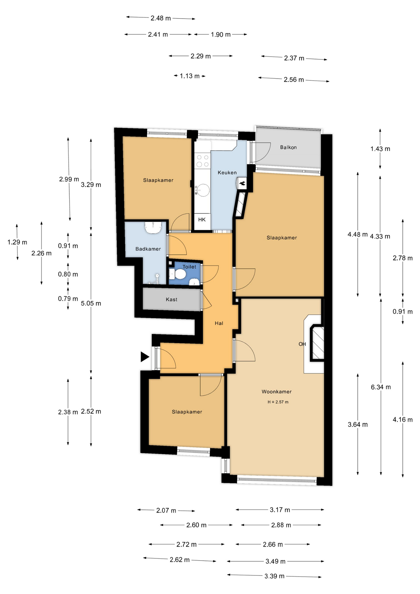 A classic Hague entrance, leading into the residence’s foyer, with a U-shaped corridor providing access to all rooms. The 1st bedroom is situated at the front of the residence and features a double-glazed window with a PVC frame. Entering the living room, one is greeted by a gas fireplace, wooden double-glazed windows, and recessed ceiling spotlights. A deep storage closet in the corridor accommodates surfboards and seasonal items. Separate toilet with a small washbasin. The bathroom comprises a walk-in shower, washbasin with shelf, bathroom cabinet, designer radiator, and washing machine connection. The second bedroom, at the rear, boasts double-glazed PVC windows with ventilation grilles. The adjacent kitchen is equipped with a fridge/freezer, induction hob, extractor hood, oven, and a Vaillant CV combi boiler from 2015. A door leads to the deep balcony, perfect for unwinding with a drink after work. The third bedroom, also at the rear, offers a splendid unobstructed view.