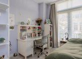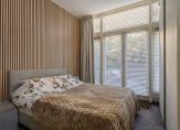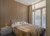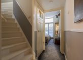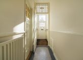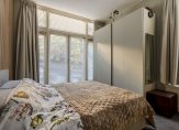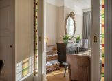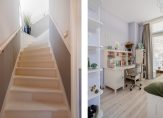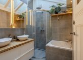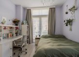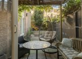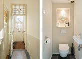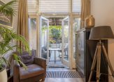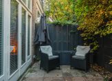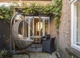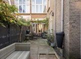 Aan de achterzijde een tweede hal met toegang naar de schitterende badkamer voorzien van lichtstraat, fraai lichtgrijs tegelwerk, inloopdouche, ligbad en badkamermeubel voorzien van twee waskommen en spiegelkast. In deze hal is de technische ruimte gesitueerd met cv-ketel en opstelplaats voor wasmachine en droger. De eerste slaapkamer is uitzonderlijk rustig gelegen en beschikt over airconditioning en openslaande deuren naar de achtertuin. Tot slot een trap naar de eerste etage voorzien van tweede ruime slaapkamer met gunstige lichtinval, airconditioning, hoog plafond, vaste kast en openslaande deuren naar achterbalkon.