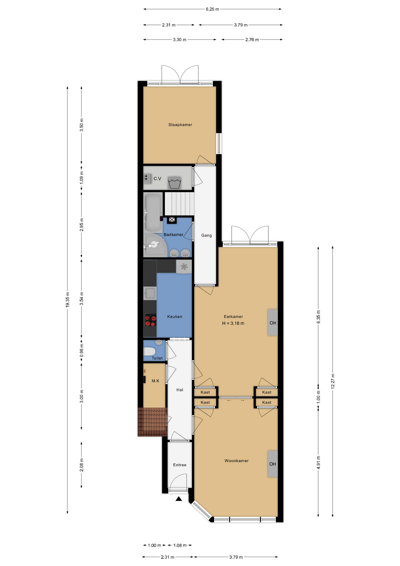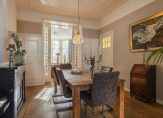 Eigen entree op straatniveau, vestibule met tochtdeur naar de hal met granieten vloer, diepe trapkast met uitgebreide elektrische installatie en toilet voorzien van wandcloset, fonteintje en nis. Vanuit de hal de woon-/eetkamer en suite met visgraat parketvloer, suiteseparatie met glas in lood schuifdeuren en ca. 3.18 meter hoge ornamenten plafonds. Aan de achterzijde de serre met openslaande deuren naar L-vormige achtertuin voorzien van pergola. Naast de woonkamer is de dichte keuken gesitueerd die is voorzien van granieten vloer, bakoven, inbouwmagnetron, vaatwasser en brede inductiekookplaat.