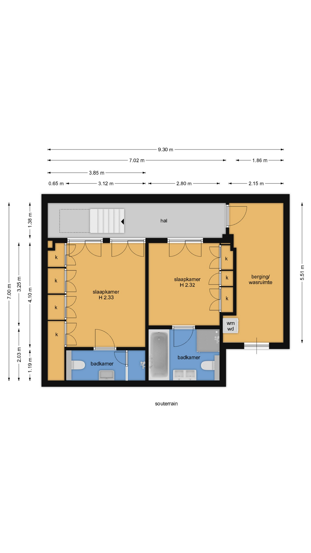 Vanuit de woonkamer de trap naar het souterrain, gang met deur voorzien van glasroedeverdeling naar hoofdslaapkamer met ingebouwde kastenwand en eigen badkamer voor zien van toilet, wastafel en douche. De tweede slaapkamer is eveneens rustig gelegen en voorzien van kastenwand en eigen badkamer voorzien van ligbad, wastafel, douche en toilet.