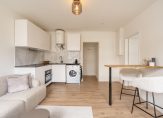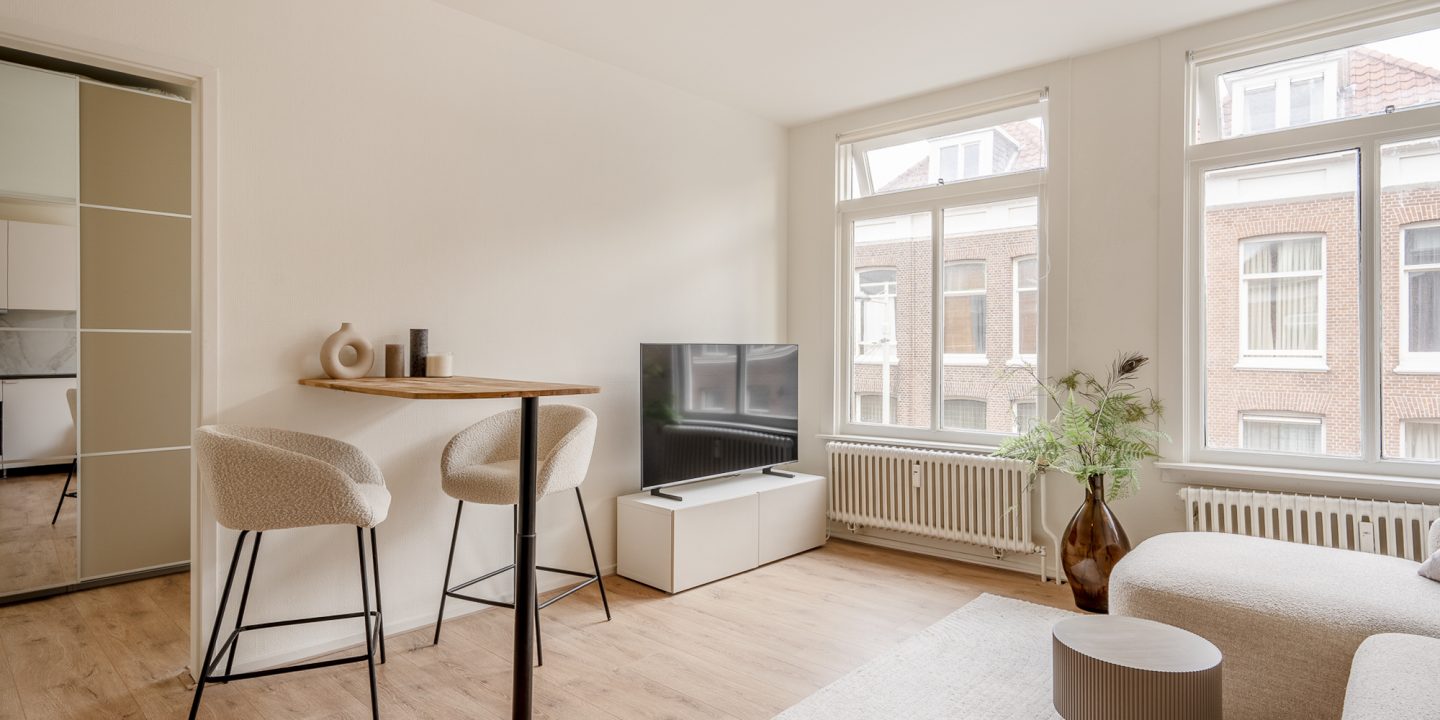 Gezamenlijke entree op straatniveau, toegang tot de gezamenlijke wasruimte. Trap naar de tweede etage, entree appartement, ruime open woonkamer met een heerlijk lichtinval en open keuken, welke is voorzien van inductiekookplaat, oven, afzuigkap, boiler, koelkast en de mogelijkheid tot het aansluiten van een vaatwasser of wasmachine. Vanuit de woonkamer toegang tot de slaapkamer. Tussengelegen de badkamer, welke is voorzien van wastafel met meubel, douche en het toilet.