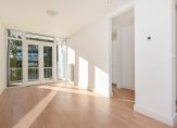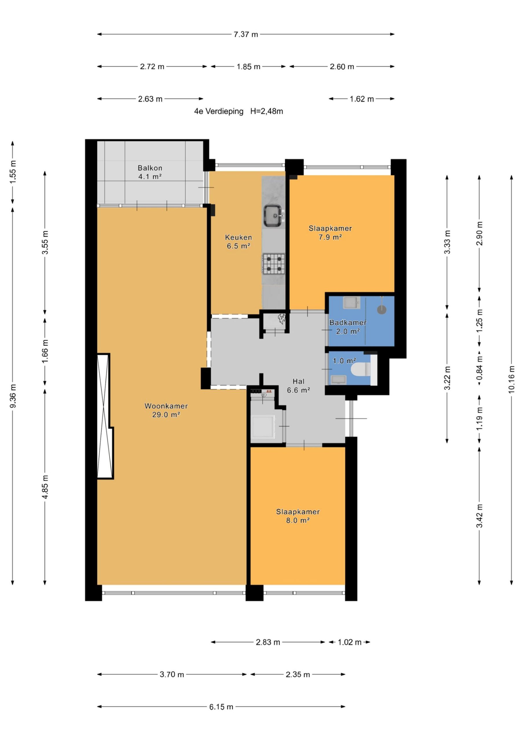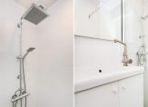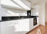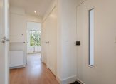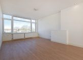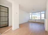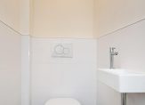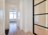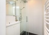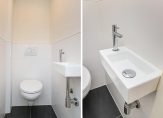 Gezamenlijke entree op straatniveau, trap naar de 4e etage, entree appartement, hal met garderobekast, apart toilet, slaapkamer aan de voorzijde, woonkamer met een fantastische lichtinval dankzij grote raampartijen, aan de achterzijde de deuren naar het ruime balkon dat op de middag- en avondzon is gelegen. De hoofdslaapkamer is rustig gelegen aan de achterzijde van het complex en goed van formaat. De tussengelegen moderne keuken beschikt over een ruim werkblad, inbouwoven, koel-/vriescombinatie, afzuigkap, vaatwasser en inductiekookplaat. Tot slot de tussengelegen badkamer voorzien van fraai tegelwerk, inloopdouche, handdoekradiator en badkamermeubel met wastafel..