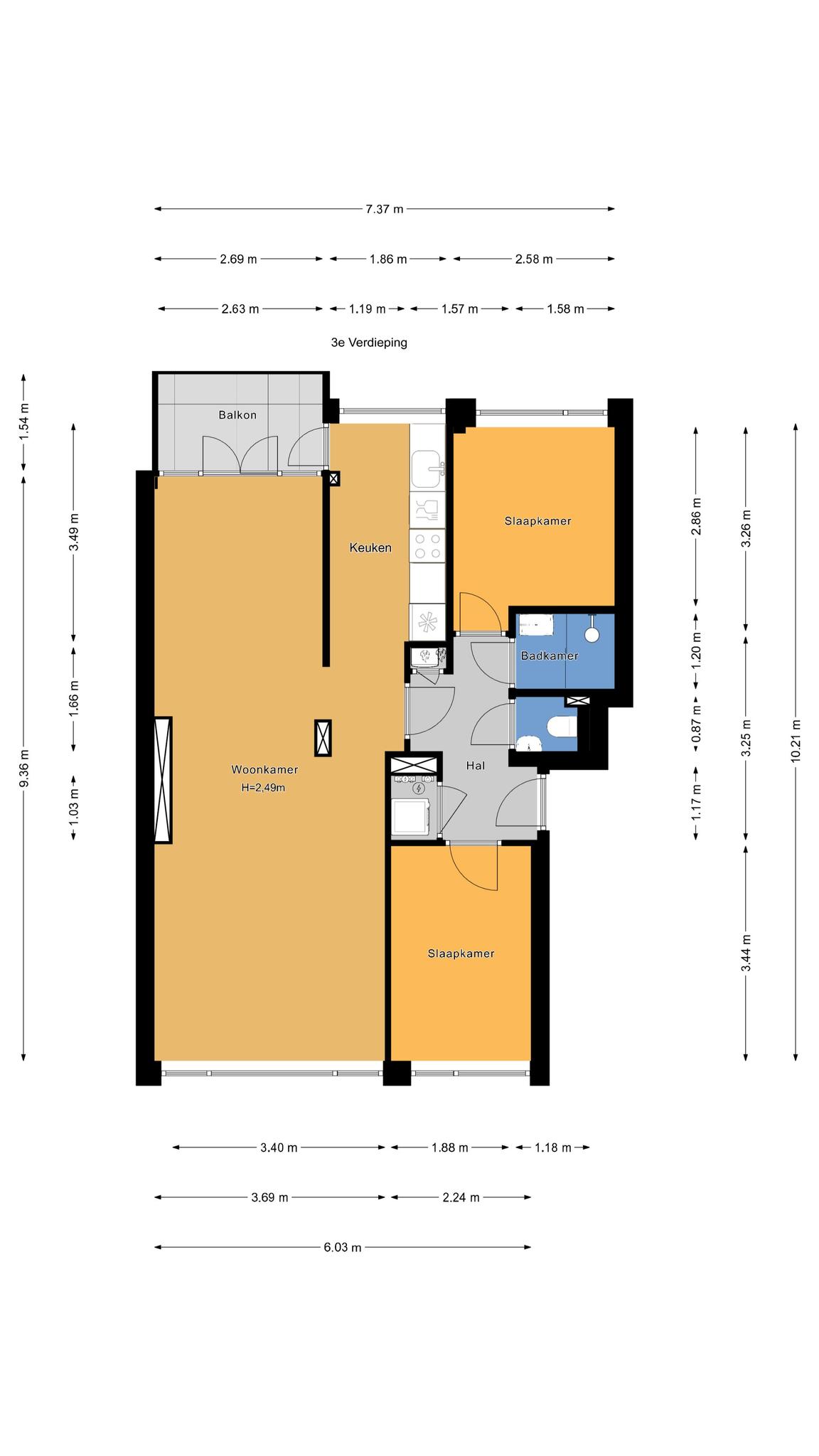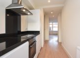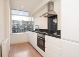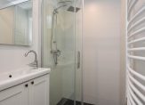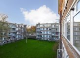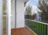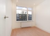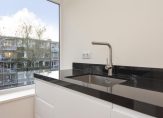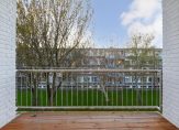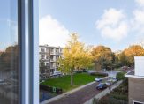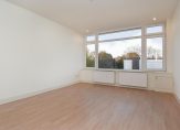 Trap naar de 3e etage, entree appartement, hal met garderobekast, apart toilet, slaapkamer aan de voorzijde, woonkamer met zeer gunstige lichtinval dankzij grote raampartijen aan drie zijden en openslaande deuren naar ruim balkon dat op de middag- en avondzon is gelegen. De hoofdslaapkamer is rustig gelegen aan de achterzijde van het complex en goed van formaat. De keuken is eveneens aan de achterzijde gelegen en beschikt over eenvoudig keukenblok en opstelplaats voor de cv-ketel. Tot slot de tussengelegen badkamer met keurig tegelwerk, inloopdouche en meubel met wastafel.